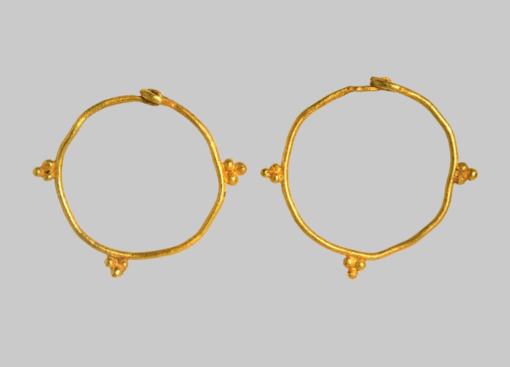 Golddrahtring mit Haken-Ösenverschluss, an drei Stellen sind außen je drei kleine Goldkügelchen appliziert.
