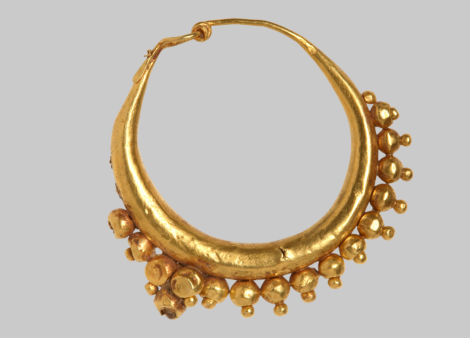 Lunulaförmiges Ohrgehänge aus Goldblech (Dm max. 0,45 cm) mit Haken-Ösenverschluss. Die Außenseite ist mit kleinen Goldkügelchen besetzt, die wie Granatäpfel wirken. An unterster Stelle eine zusätzliche Kügelchenpyramide.