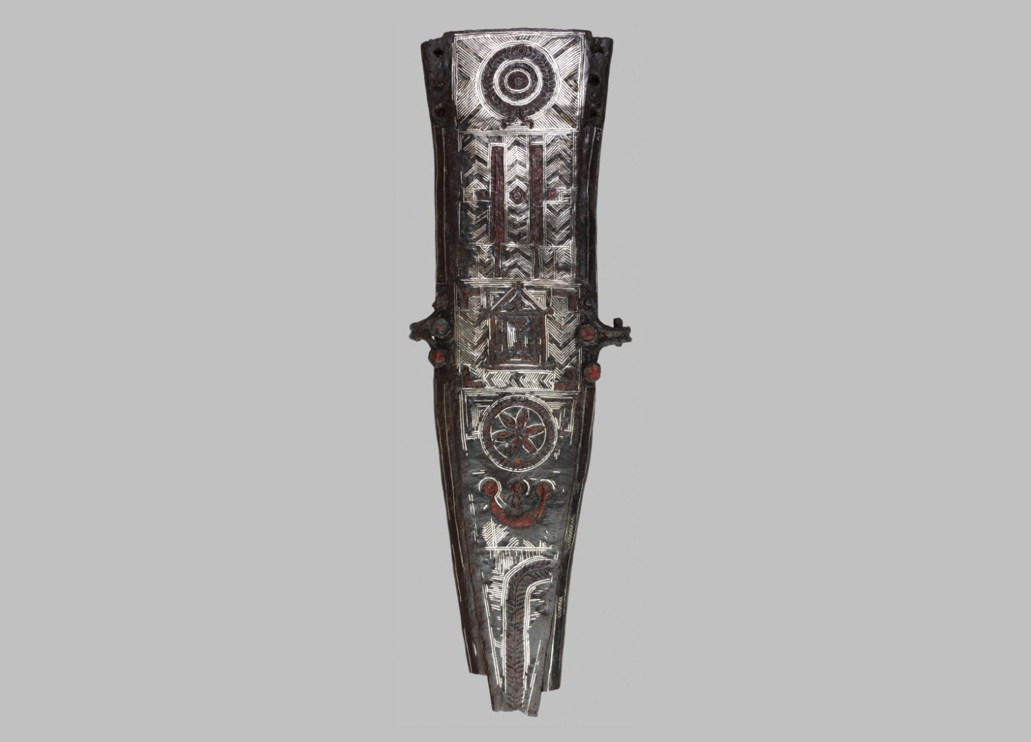 Scheidenblech und Randbeschlag sind aus Eisen. Das Scheidenblech war mit Holz hinterlegt, davon haben sich noch Reste an der abgebrochenen Spitze erhalten. Die Teile waren durch vier zusammengeschweißte Zwingen, von denen noch zwei zu sehen sind, mit zwölf Nieten zusammengehalten. Zusätzlich war auch am – nicht mehr erhaltenen – Ortband ein Niet angebracht. Vor der Montage der Einzelteile wurden der vordere Scheidenbeschlag und der Randbeschlag mit Silber und Messing tauschiert und mit roten Emaileinlagen verziert. Auch die Nieten der Zwingen sind mit Email gefüllt. Feine, geometrisch angeordnete Silberfäden und sechs Felder mit Tauschierung und Emaileinlage zieren das vordere Scheidenblech. Erstes Feld: Darstellung eines Kranzes in rotem Email, dazwischen lineare Silberfadenverzierung. Zweites Feld: Zwei Rutenbündel (fasces) in rotem Email und dachförmig gestellte Silberfäden. Drittes Feld: Darstellung einer Tempelfront mit Giebeldach und Akroteren in rotem Email. Der gegliederte Giebel, Säulen und Stufenaufgang sind gut zu sehen. Die Ecken des Bildfeldes sind mit Winkelfeldern in rotem Email herausgehoben, der Hintergrund mit dachförmig gestellten Reihen von Silberfäden. Viertes Feld: Medaillon mit Darstellung der Sonnenscheibe als sechsteilige Rosette in rotem Email. Fünftes Feld: Halbmond mit scheibenförmigen Enden und einem Mittelbild (?) in rotem Email. Sechstes Feld: Palmzweig mit nach rechts gerichteter Spitze in rotem Email.