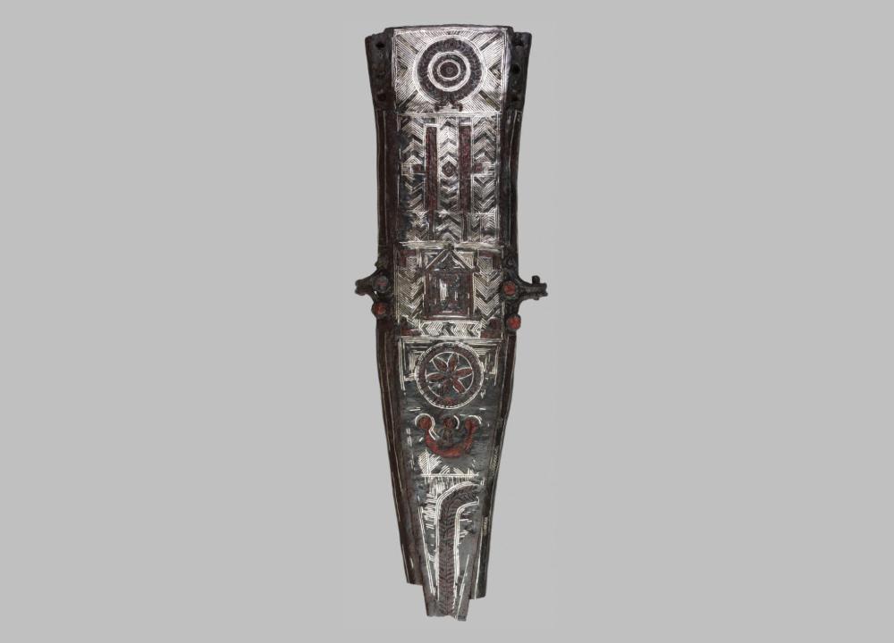 Scheidenblech und Randbeschlag sind aus Eisen. Das Scheidenblech war mit Holz hinterlegt, davon haben sich noch Reste an der abgebrochenen Spitze erhalten. Die Teile waren durch vier zusammengeschweißte Zwingen, von denen noch zwei zu sehen sind, mit zwölf Nieten zusammengehalten. Zusätzlich war auch am – nicht mehr erhaltenen – Ortband ein Niet angebracht. Vor der Montage der Einzelteile wurden der vordere Scheidenbeschlag und der Randbeschlag mit Silber und Messing tauschiert und mit roten Emaileinlagen verziert. Auch die Nieten der Zwingen sind mit Email gefüllt. Feine, geometrisch angeordnete Silberfäden und sechs Felder mit Tauschierung und Emaileinlage zieren das vordere Scheidenblech. Erstes Feld: Darstellung eines Kranzes in rotem Email, dazwischen lineare Silberfadenverzierung. Zweites Feld: Zwei Rutenbündel (fasces) in rotem Email und dachförmig gestellte Silberfäden. Drittes Feld: Darstellung einer Tempelfront mit Giebeldach und Akroteren in rotem Email. Der gegliederte Giebel, Säulen und Stufenaufgang sind gut zu sehen. Die Ecken des Bildfeldes sind mit Winkelfeldern in rotem Email herausgehoben, der Hintergrund mit dachförmig gestellten Reihen von Silberfäden. Viertes Feld: Medaillon mit Darstellung der Sonnenscheibe als sechsteilige Rosette in rotem Email. Fünftes Feld: Halbmond mit scheibenförmigen Enden und einem Mittelbild (?) in rotem Email. Sechstes Feld: Palmzweig mit nach rechts gerichteter Spitze in rotem Email.