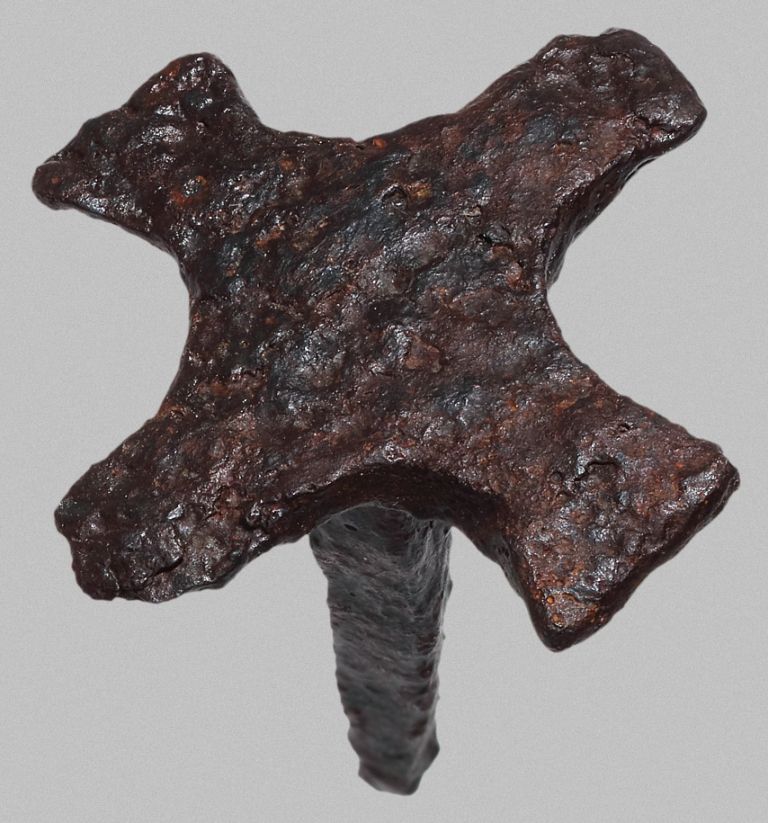 Schildbuckelnagel mit kreuzförmigem Kopf und im Querschnitt vierkantigem, fragmentiertem Schaft.
