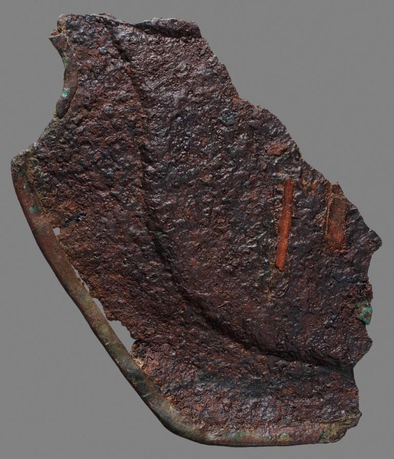 Rechtes Wangenklappenfragment eines Helms. Der Randsaum ist mit u-förmigen Bronzeschienen besetzt.