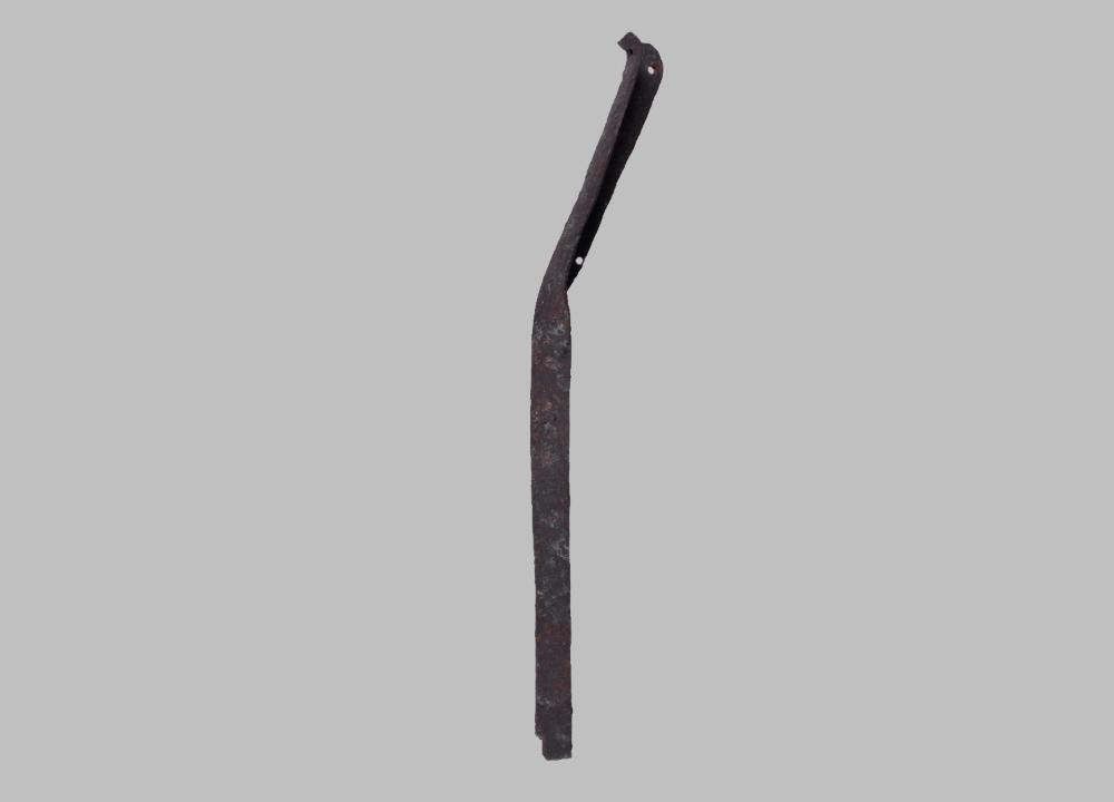 Fragment eines Scheidenbeschlages, gebogen mit fünf kreisförmigen Löchern und v-förmigem Querschnitt.