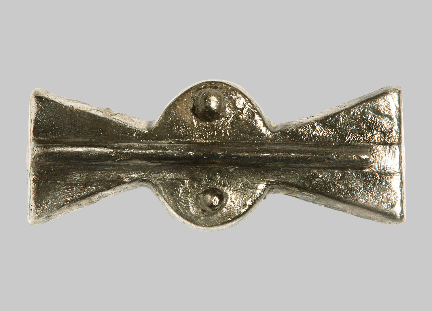 Fibel mit propellerförmiger Kopfplatte. Mittelrippe in Längsrichtung und Buckelverzierung am Mittelteil. Halterung und Einhängevorrichtung für Nadel auf der Rückseite erhalten. Die Nadel fehlt.