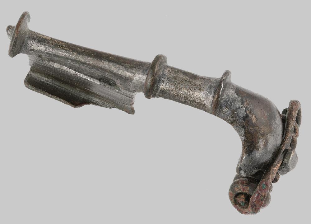 Zwei kammförmige Bügelknoten, nur auf der Oberseite ausgebildet. Rahmenförmiger Nadelhalter. Kammförmiger Fußknopf mit Enddorn. Leicht kolbenförmiger Kopf. Acht Windungen der Spirale, obere Sehne und Spiralhaken erhalten. Nadel fehlt.