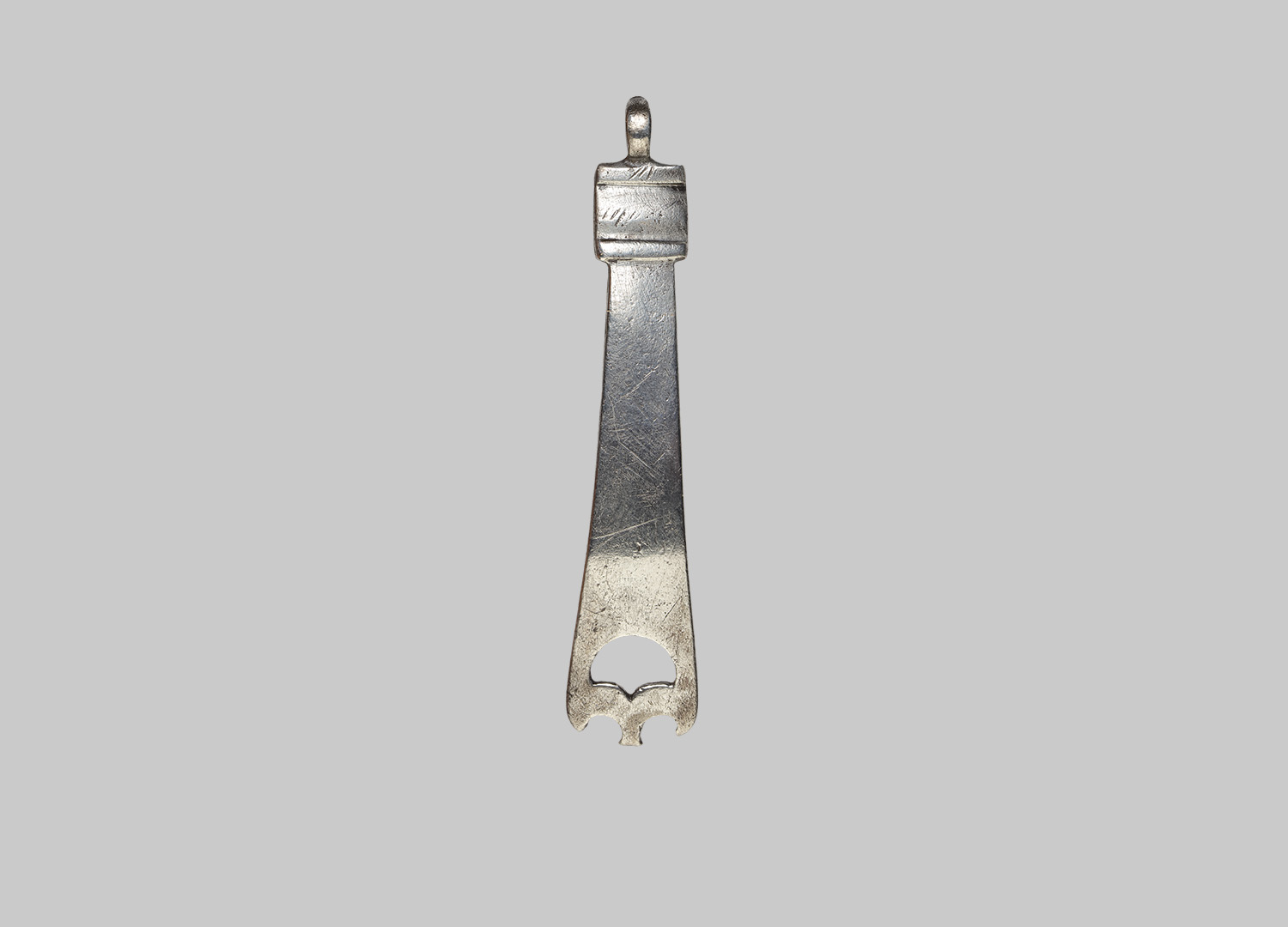 Unterer Teil eines zweigliedrigen Endbeschlags mit Scharnierösen, ausgeführt in durchbrochenem Dekor.