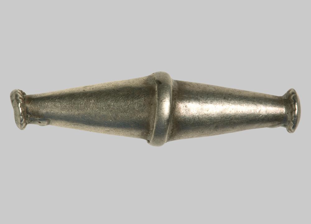 Silberne spindelförmige Perle aus zwei zusammengesetzten Teilen mit breitem Mittelsteg. An beiden Enden manschettenförmiger Abschluss.