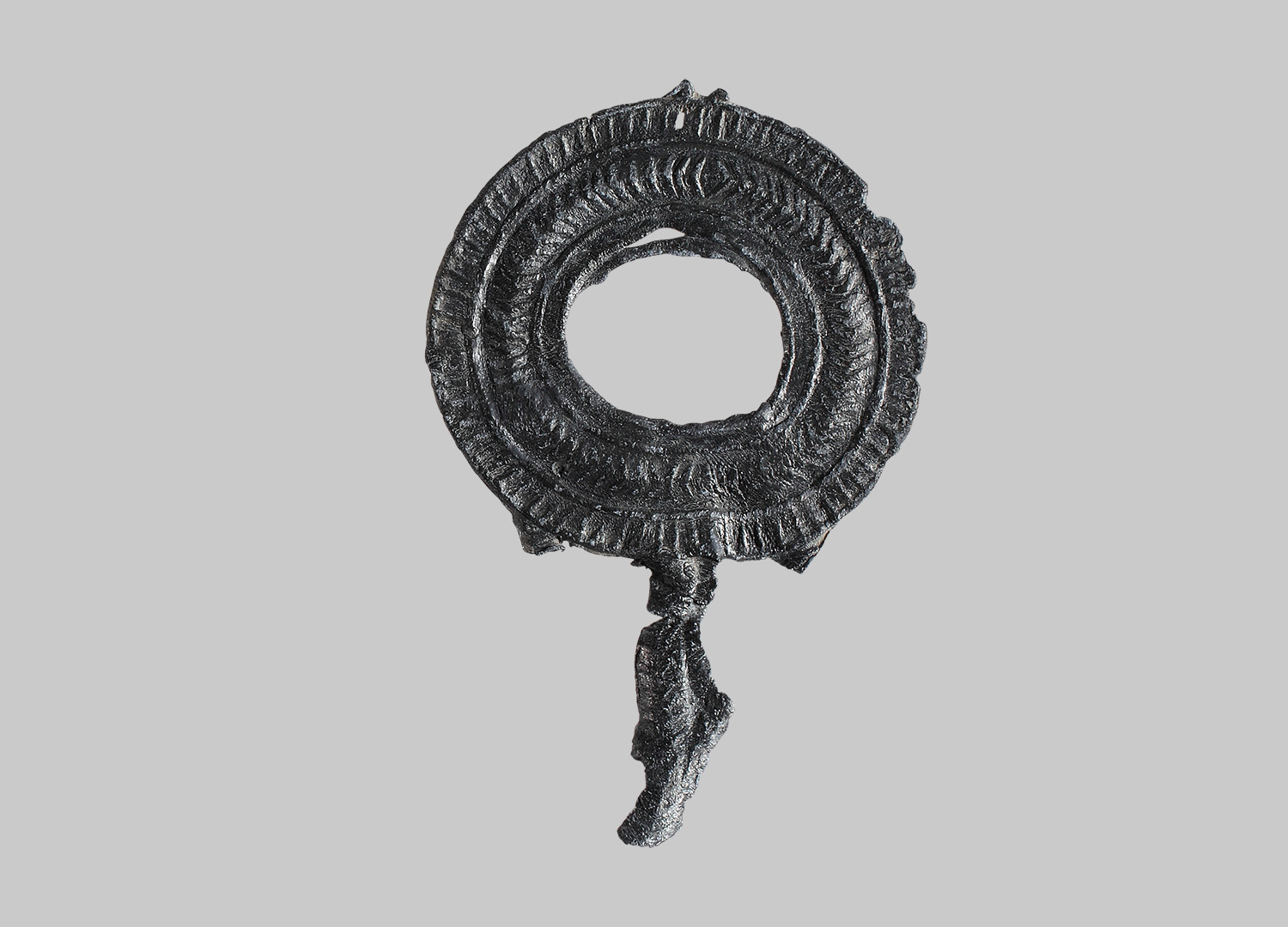 breiter Spiegelrahmen mit drei konzentrischen Kreisen, äußerer Kreis mit Radialmuster und mittlerer Kreis mit Fischgrätmuster; oben Ansatz von Schlaufe erhalten; unten Griff in Fischgrätmuster.