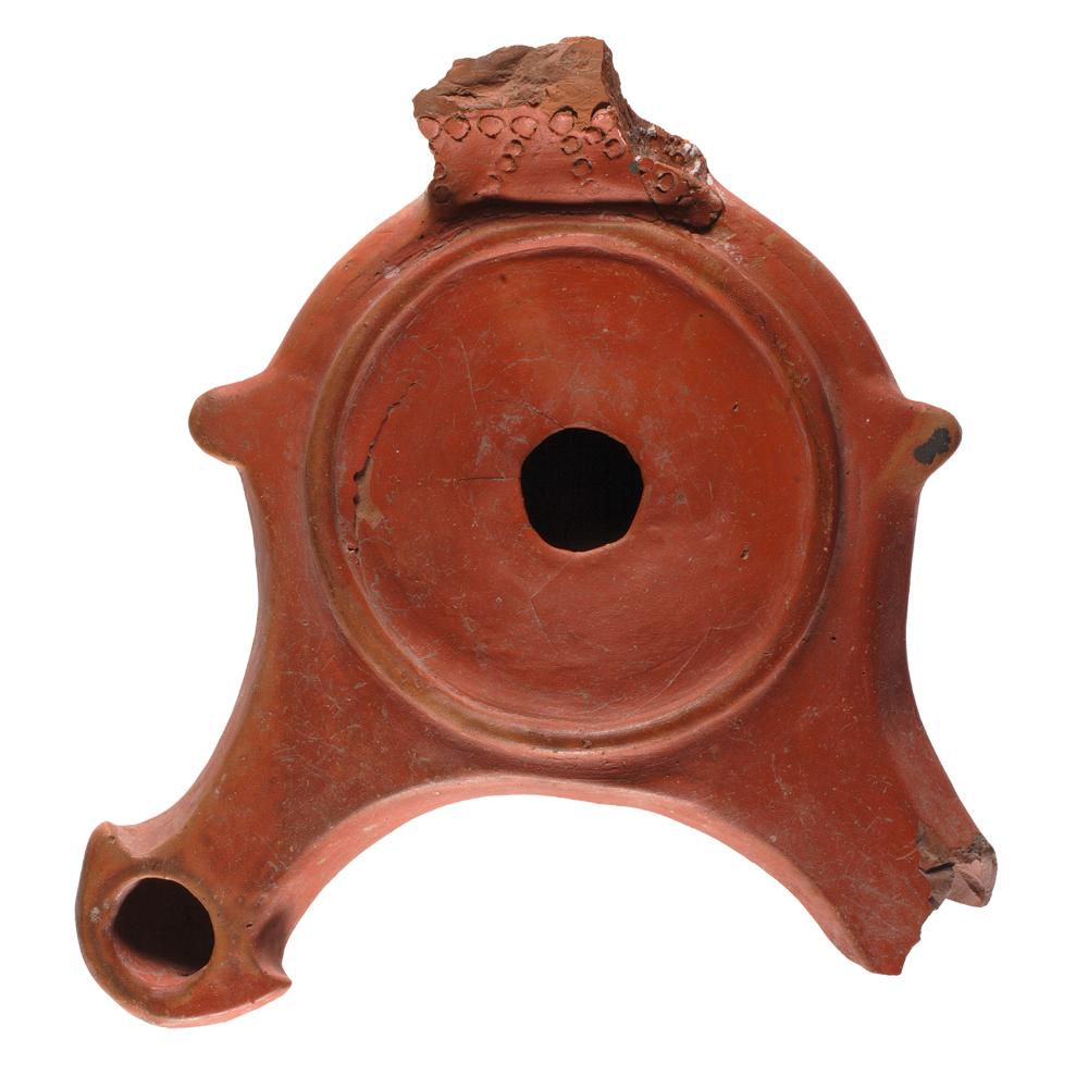 Zweiflammige Ständerlampe. Überdimensionierte zweischnauzige Lampe mit gerundeten Volutenschnauzen. Der mit gestempelten, kreisförmigen Elementen geschmückte Henkel ist nur im Ansatz erhalten.