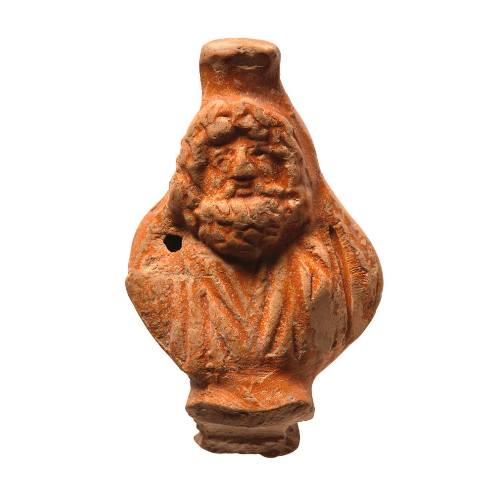 Lampengriff in Gestalt einer Büste des vollbärtigen Sarapis. Auf seinem dichten, lockigen Haar trägt er einen Modius (Getreidemaß). Seine Kleidung ist V-förmig drapiert. Im Bereich der Schulter ist ein Loch oder eine Bruchstelle festzustellen. An der Unterseite der Büste befindet sich ein Untersatz, an den ein weiteres, nach hinten verlaufendes Tonstück ansetzt.