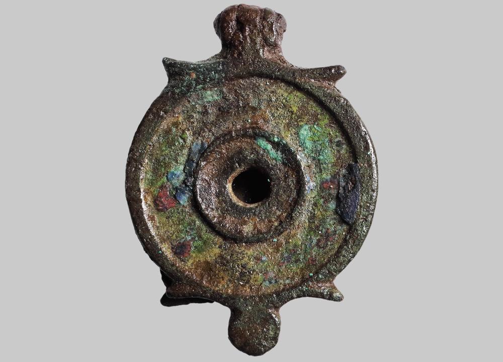 Rund. Seitliche Fortsätze und scheibenförmiger Abschlussknopf. Auf der Deckeloberseite zwei kreisrunde Vertiefungen mit Emailresten (rot, blau, grün).