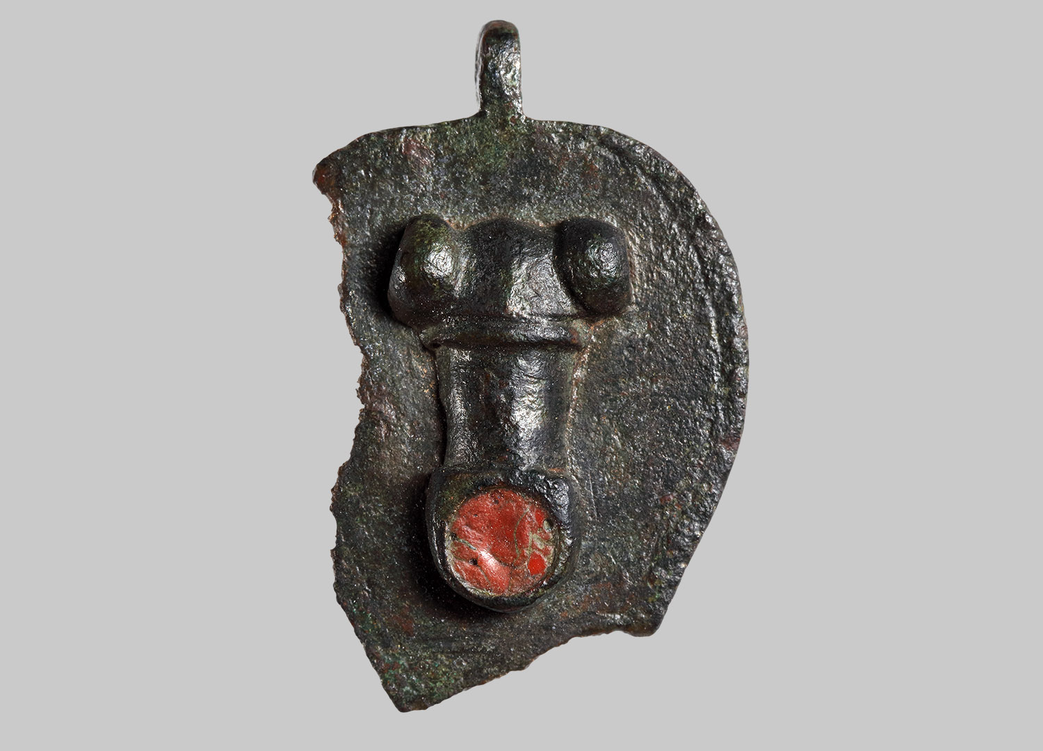 Am Deckel ein Phallusrelief mit einer roten Emaileinlage an der Spitze. Dass solche Phallusbilder auf Siegelkapseln häufig waren, erklärt sich einerseits wohl dadurch, dass sie als schadenabwehrend galten; sie sollten also vor Verlust des Poststücks und vor Verletzung des Briefgeheimnisses schützen. Andererseits ist aber auch erwogen worden, dass mit dem Vorgang des Versiegelns bzw. Verschließens/Petschierens in der Antike (wie auch später) der Gedanke an sexuelle Betätigung assoziiert wurde.