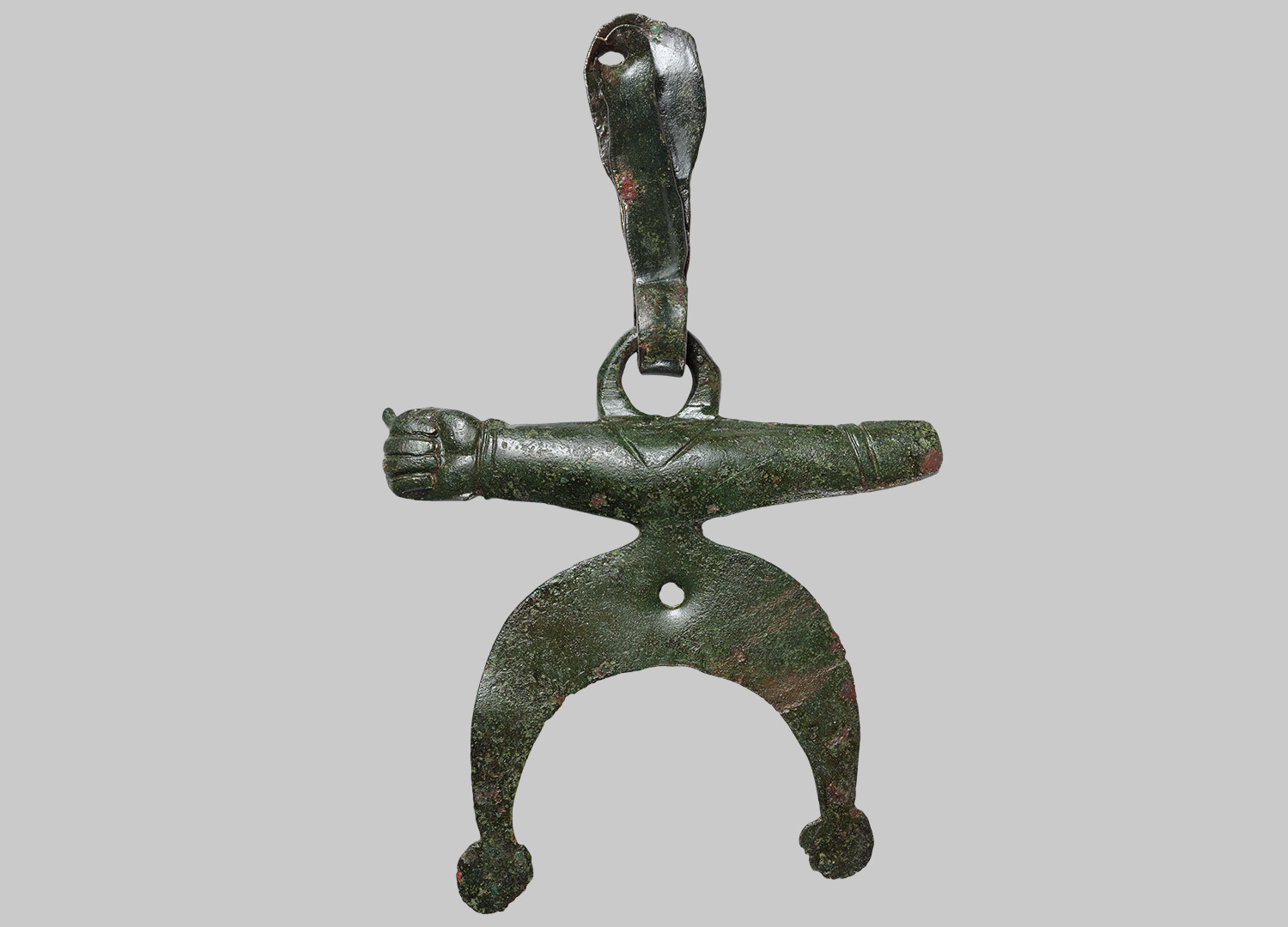 An Aufhängevorrichtung (Beschlag von Lederriemen(?), in Aufhängeöse greifend) ein Amulett in Form eines Querbalkens und eines sich darunter anschließenden Halbmonds mit abwärts gekehrten, scheibenförmig verdickten Spitzen. Das balkenförmige Element endet rechts als Phallus und links als Handinnenfläche mit der Fingergeste der sogenannten Feige (fica). Die Geste der »Feige« symbolisiert entweder das weibliche Genital oder den Koitus.