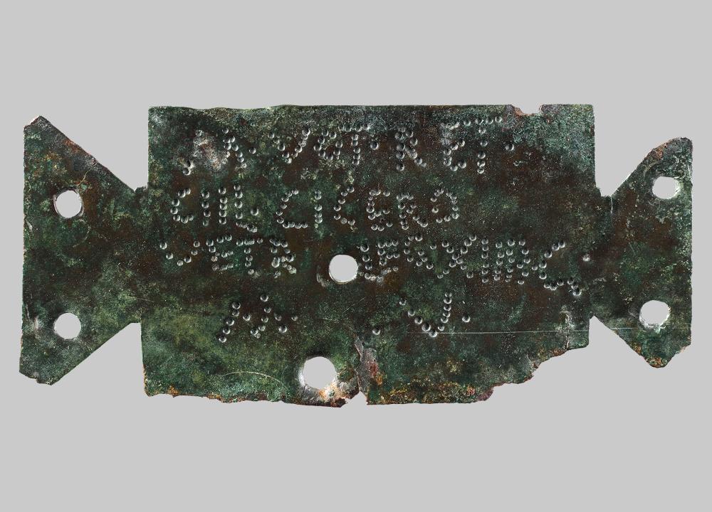 Tafel in Form einer tabula ansata mit sechs Befestigungslöchern. Vierzeilige Inschrift mit punzierten Buchstaben:
