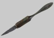 Blattförmiger Spatel mit Grat. Im Querschnitt vierkantiger Stiel mit profiliertem Stielansatz.