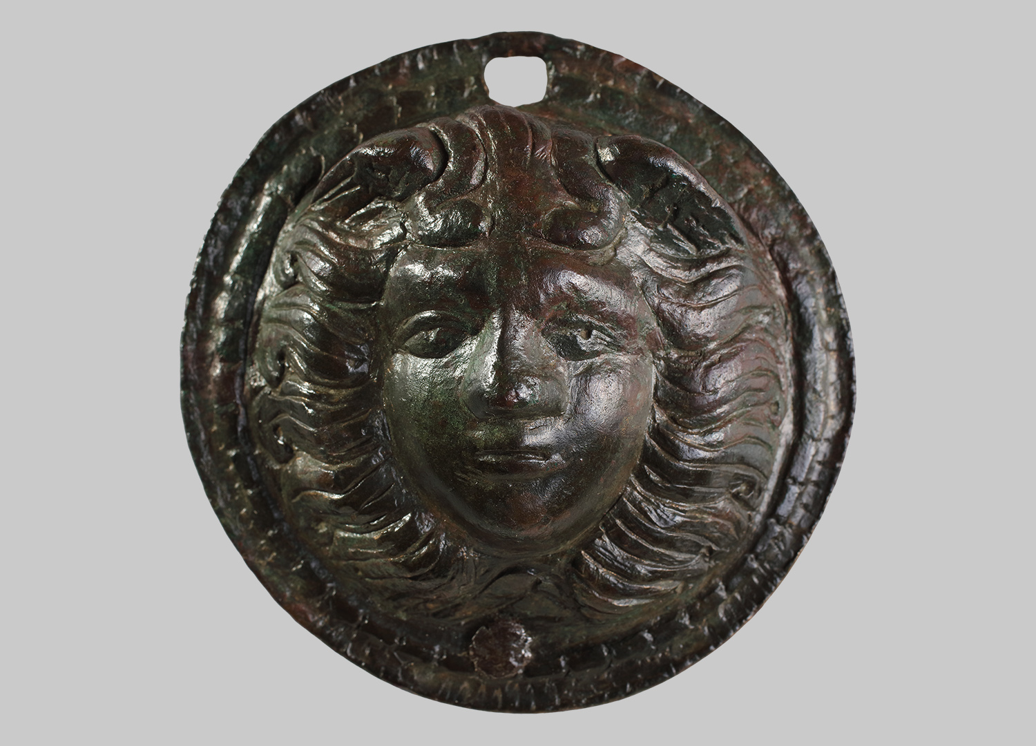Medusenhaupt mit zwei Flügeln und zwei Schlangen über der Stirn. Mähnenartig zum Rand hin verlaufendes Haar. Der flache Rand ist mit stilisiertem Perlstabdekor verziert. Ein Befestigungsloch.