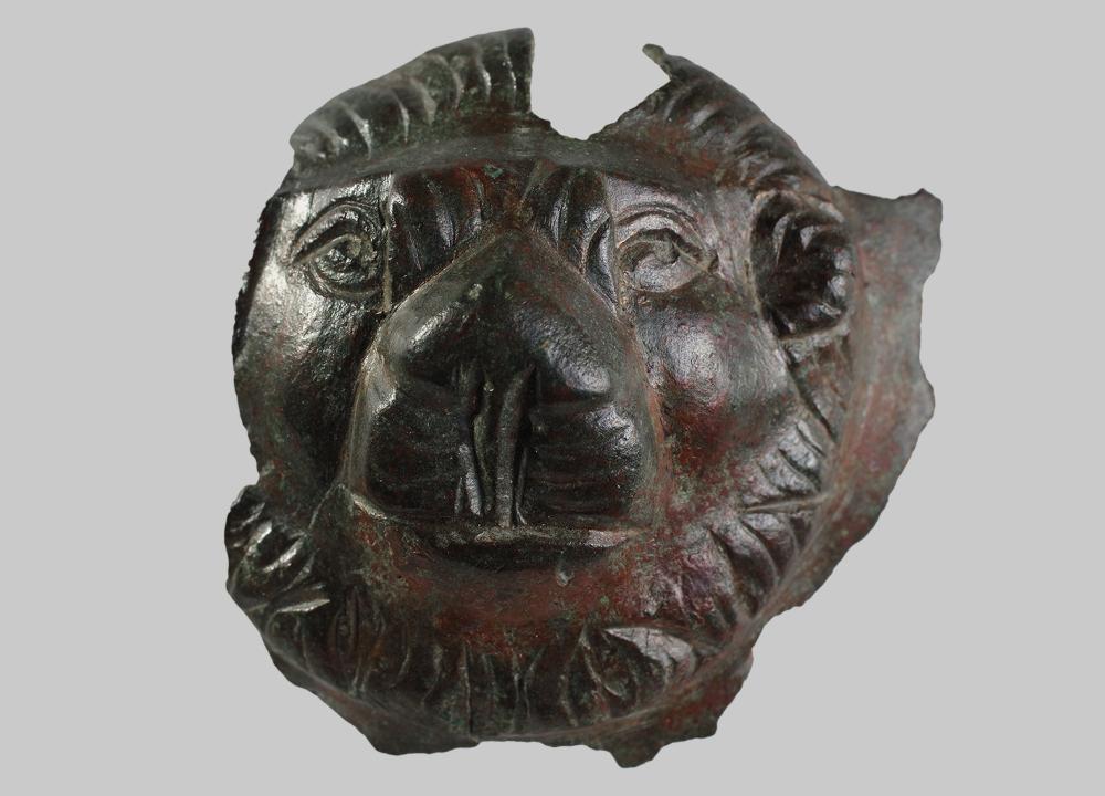Plastischer Löwenkopf. Teile der Mähne sind weggebrochen. Der flache Rand ist nur mehr in Ansätze vorhanden.