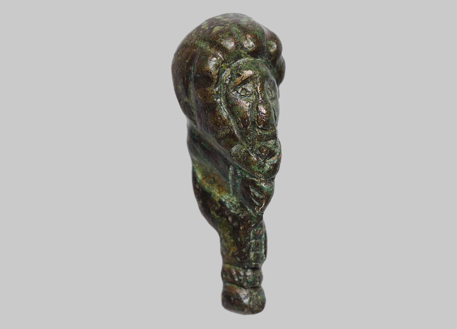 Nackte, zwergenhafte Gestalt mit übergroßem Kopf und zierlichem Körper. Das am Kinn spitz zulaufende Gesicht wird von breiten Locken und einem Vollbart gerahmt. Keine Bohrungen.