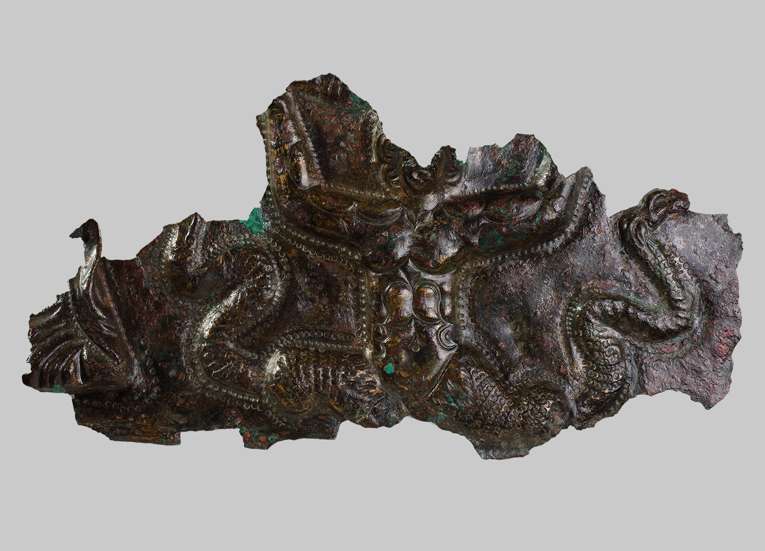 Unterer Teil der Mittelplatte einer dreiteiligen Rossstirn. Schlangenfüßiger Gigant mit erhobenen Armen und nach vorne gerichtetem Blick. Punzierte Punkte folgen dem Umriss der Figur.