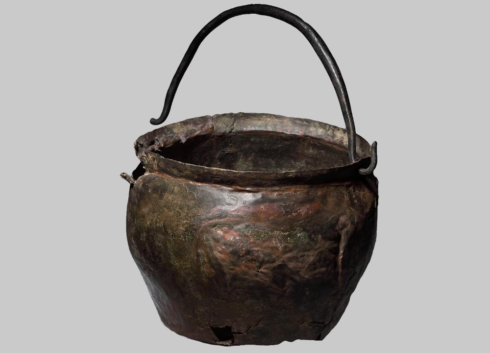 Bauchiger Topf mit Flachboden und kurzem Steilrand. Von der ursprünglichen Henkelbefestigung sind die Reste von Nietlöchern erhalten geblieben.
