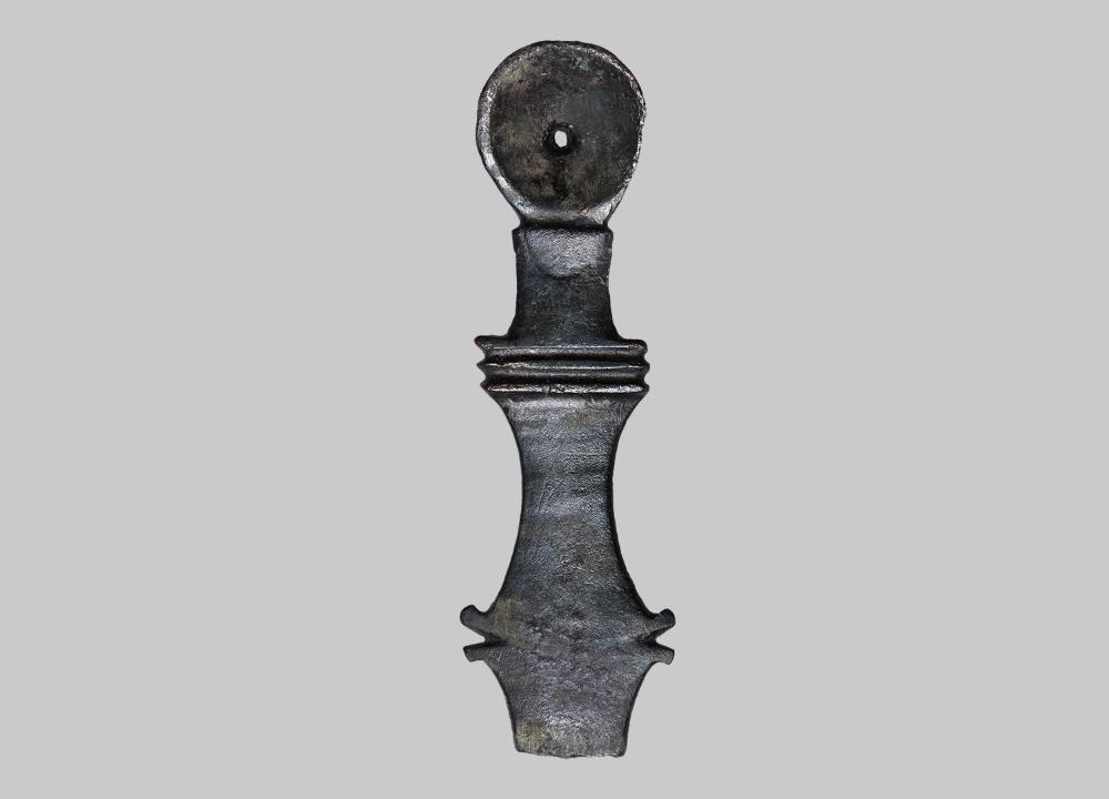 Griff eines simpulum, flach und stark gegliedert. Im unteren Drittel an den Seiten v-förmige Fortsätze, in der oberen Hälfte ein dreifach profilierter Steg. Das Ende bildet ein durchlochter Löffel.