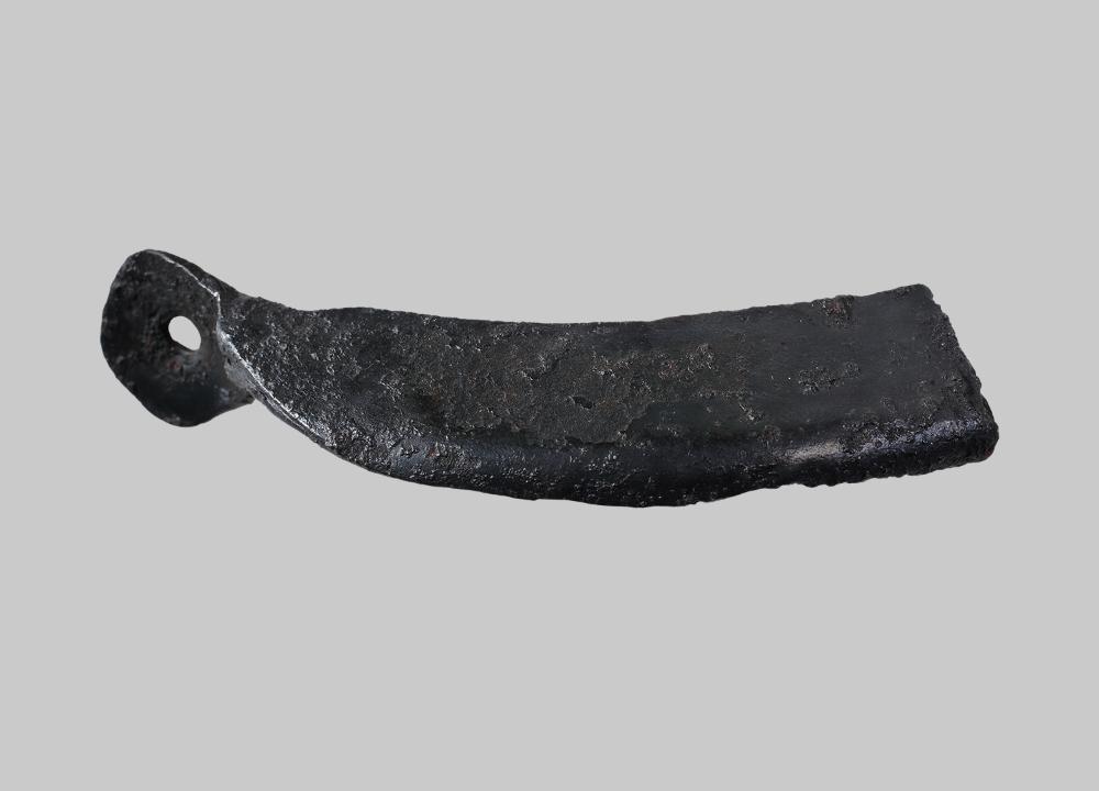Fragment eines Stirnbügels (Helmtyp Weisenau). Das erhaltene Ende des Bügels ist zu einem runden Plättchen ausgetrieben und durch eine Bohrung zu einer Öse umgestaltet. Stirnbügel wurden am Helm waagrecht über der Stirn angebracht und waren seitlich mit je einer Niete befestigt. Sie dienten als zusätzlicher Schutz für Hiebe von vorne.