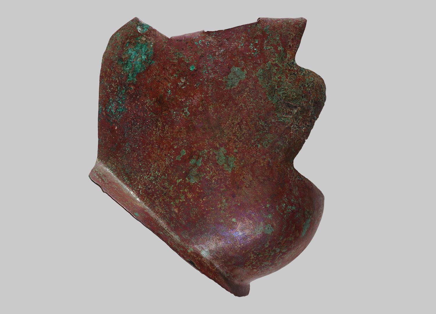 Wangenklappe vom Helmtyp Niederbieber. Teile des oberen Randes sind weggebrochen. Die Einzüge im Mund- und Augenbereich sind gut sichtbar. Der untere Rand ist schmal und leicht nach außen gebogen.