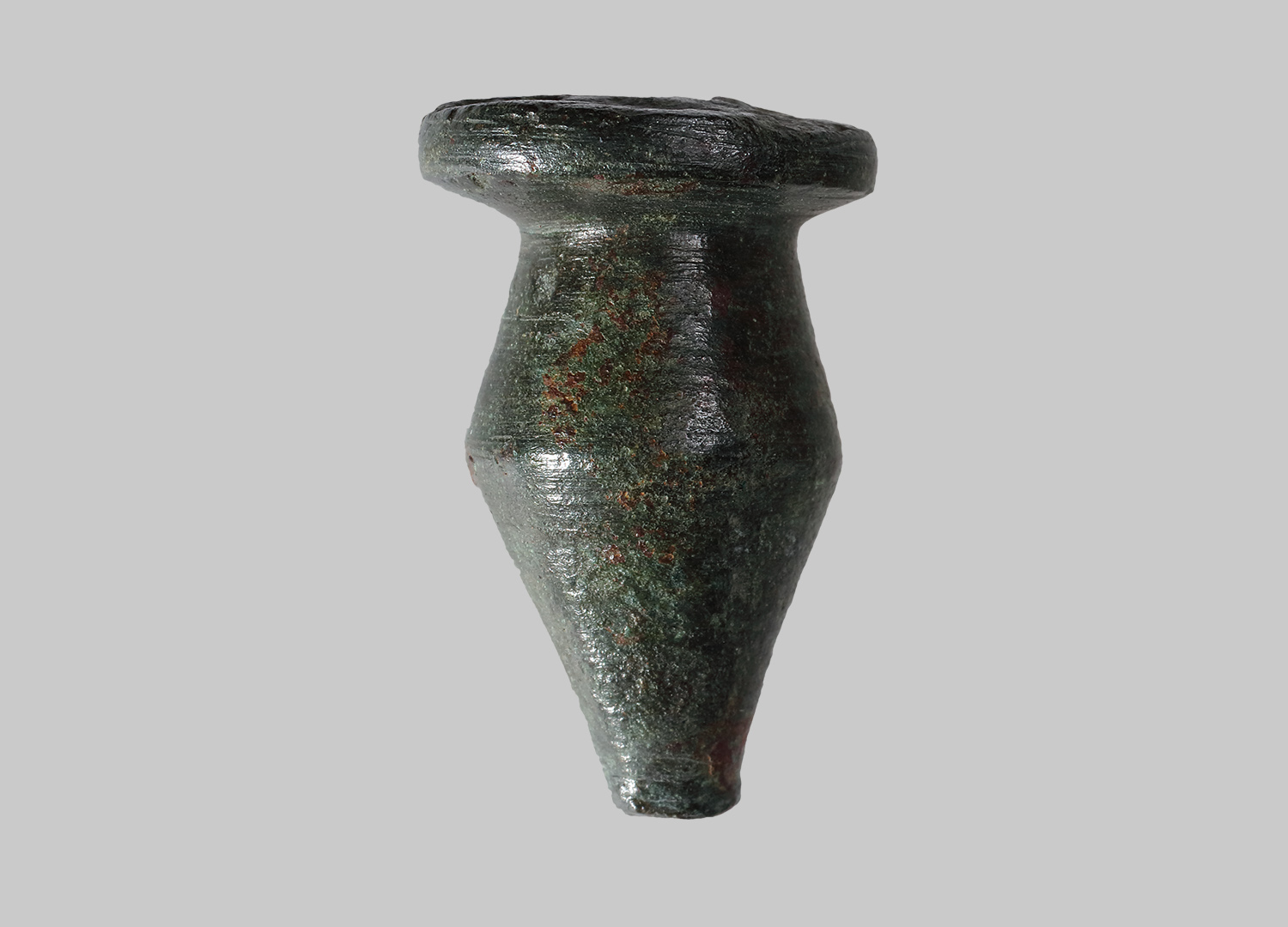 Doppelkonisch, mit runder Basis. Nietstift nur mehr im Ansatz erhalten. Wurde zur Befestigung der Kreuzbügelverstärkung auf der Helmkalotte (Helmtyp Niederbieber) verwendet.