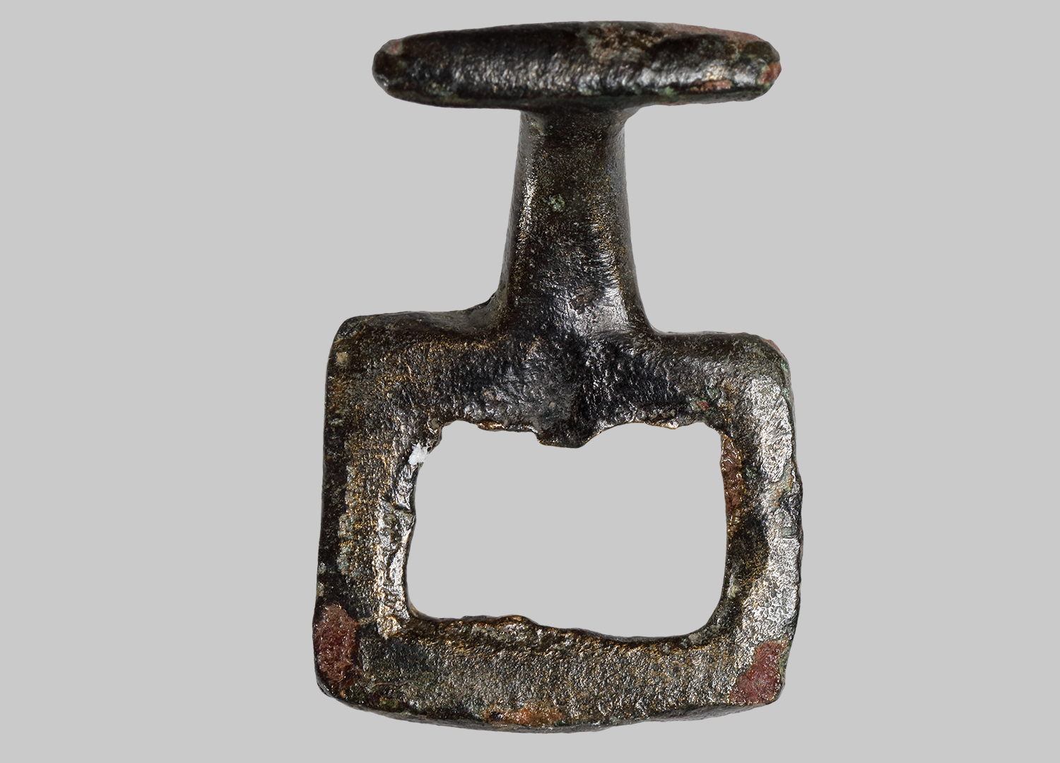Viereckiger Rahmen mit Stift und verbreitertem Gegenstück. Diente als Drehverschluss von paarweise getragenen Panzerverschlussblechen, die im Brustbereich befestigt waren. Zur Fixierung wurde ein Stift oder Splint durch das Knebelloch gesteckt.