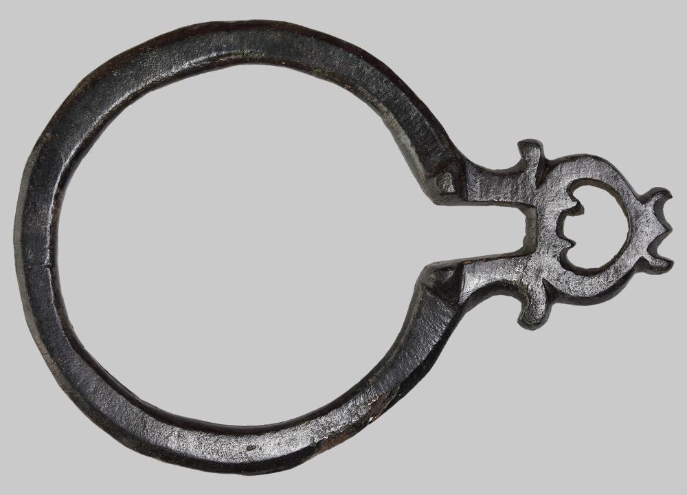 Kreisrunder Ring mit rechteckigem Ansatz, der unten ein zusätzliches durchbrochenes Zierelement und seitlich volutenartig geschwungene Enden aufweist. Rechteckiger Schlitz im Ansatz für die fehlende Nadel. An den beiden Endpunkten des Ringes je eine knopfartige Erhebung.