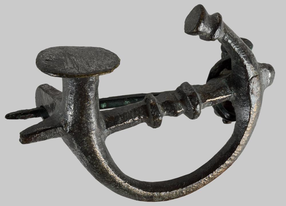 Fibel in Form eines Signalhorns (cornu). Spiralkonstruktion, Nadelhalter und Nadel auf der Rückseite erhalten.