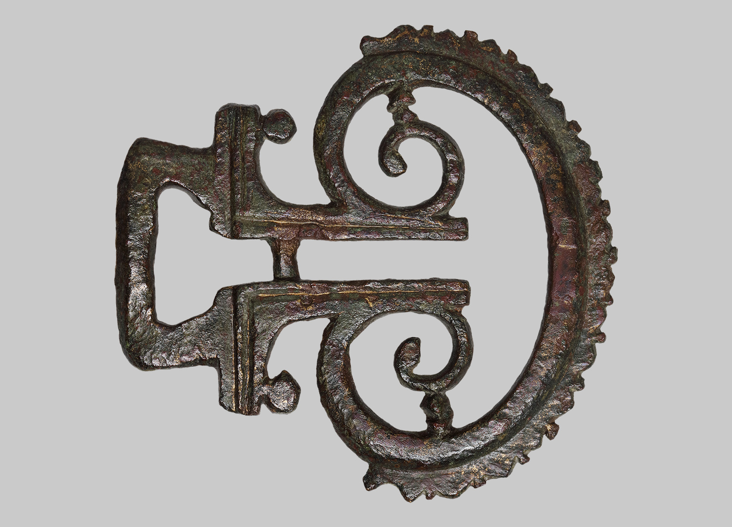 Gürtelschnalle mit Volutenenden und gezahntem äußerem Rand.