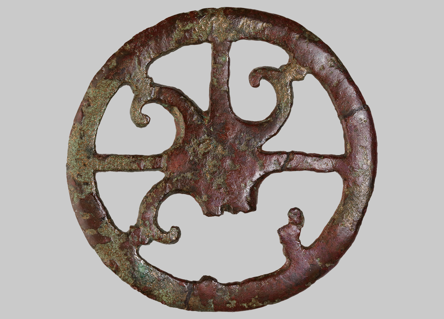 Balteusschließe, mit durchbrochenem Dekor in Form von Spiralen; auf der Rückseite Öse.