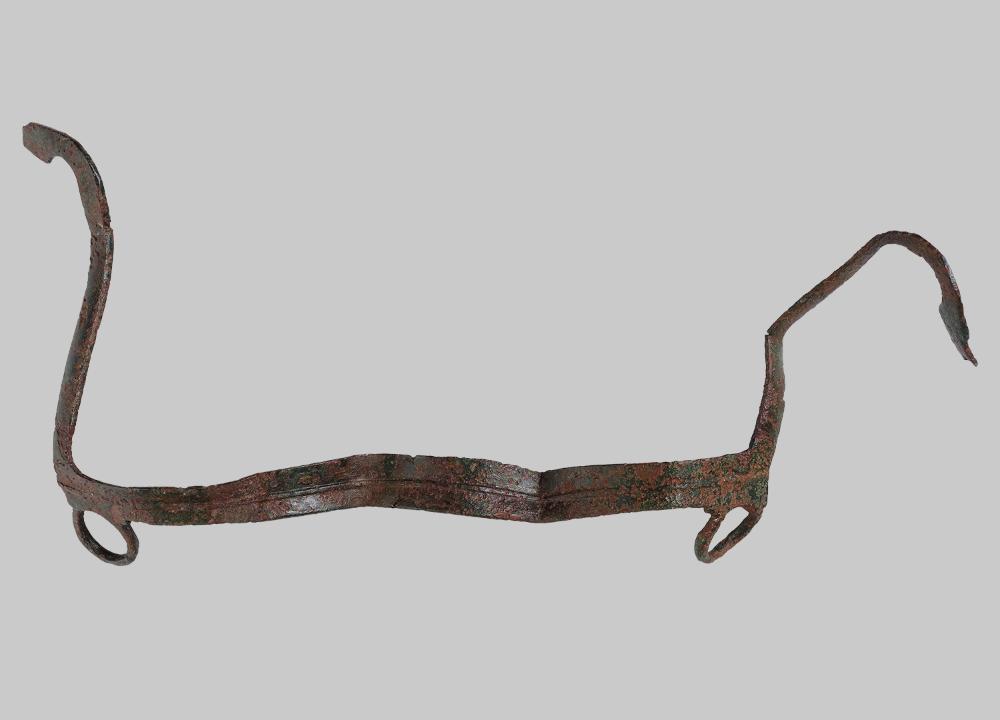 Platt gedrücktes, mehrfach geknicktes, schmales Nasenband mit einer durchgehenden mittigen Längsrille. Die beiden Seitenstege führten ursprünglich zum hier nicht mehr erhaltenen versetzten Unterbügel. Die zwei runden Ösen an den unteren Enden des Nasenbandes dienten zur Befestigung.