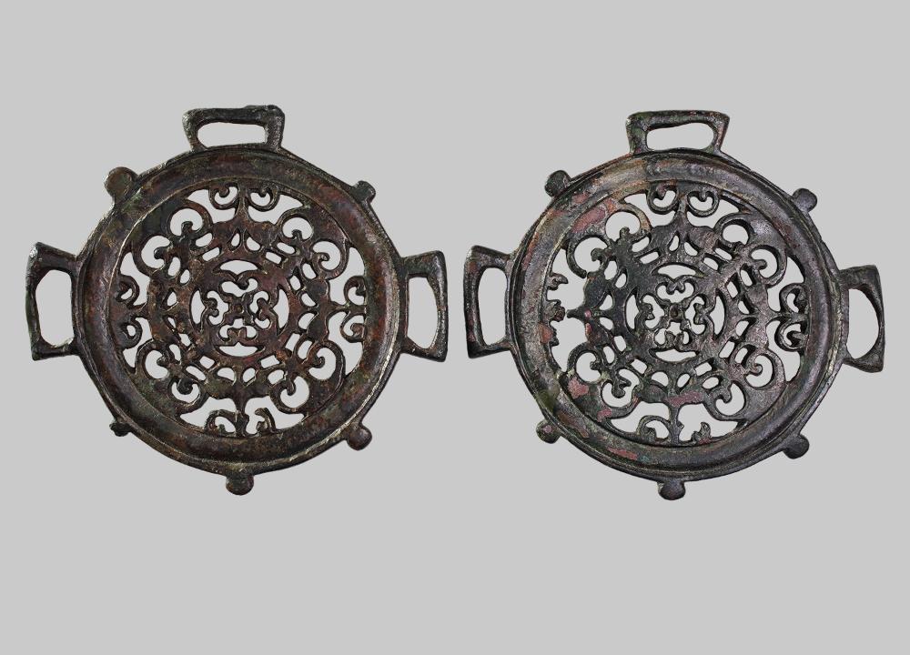 Zwei zusammengehörige Scheiben eines Pferdegeschirrs mit Durchbruchsmuster: Pelten und stilisierte Lotosblüten. Der Rand weist pro Scheibe je fünf Noppen sowie drei rechteckige Verteiler auf.