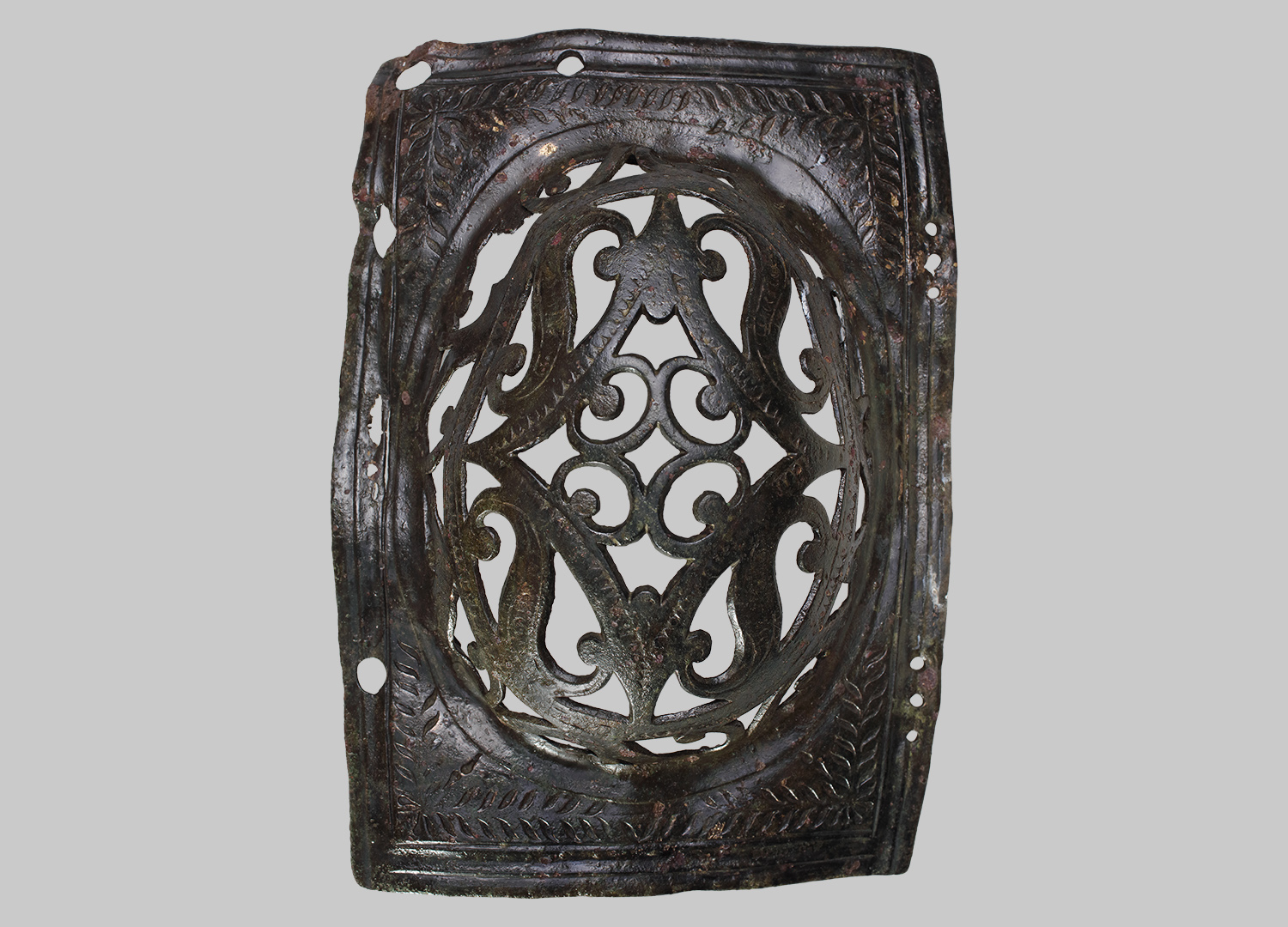 Hochrechteckige Platte mit integriertem Augenschutzkorb. Der mehrfach gerillte Rand der Platte weist mehrere unterschiedlich große Befestigungslöcher auf, die wohl zur Montage auf einer ledernen Rossstirn dienten. Der Augenschutz könnte jedoch auch mit seinem verloren gegangenen Gegenstück sowie mit einem verbindenden Mittelstück eine dreiteilige kurze Rossstirn gebildet haben. Der Schutzkorb ist mit einem Durchbruchsmuster versehen. In den Ecken der Platte ein Blattdekor.