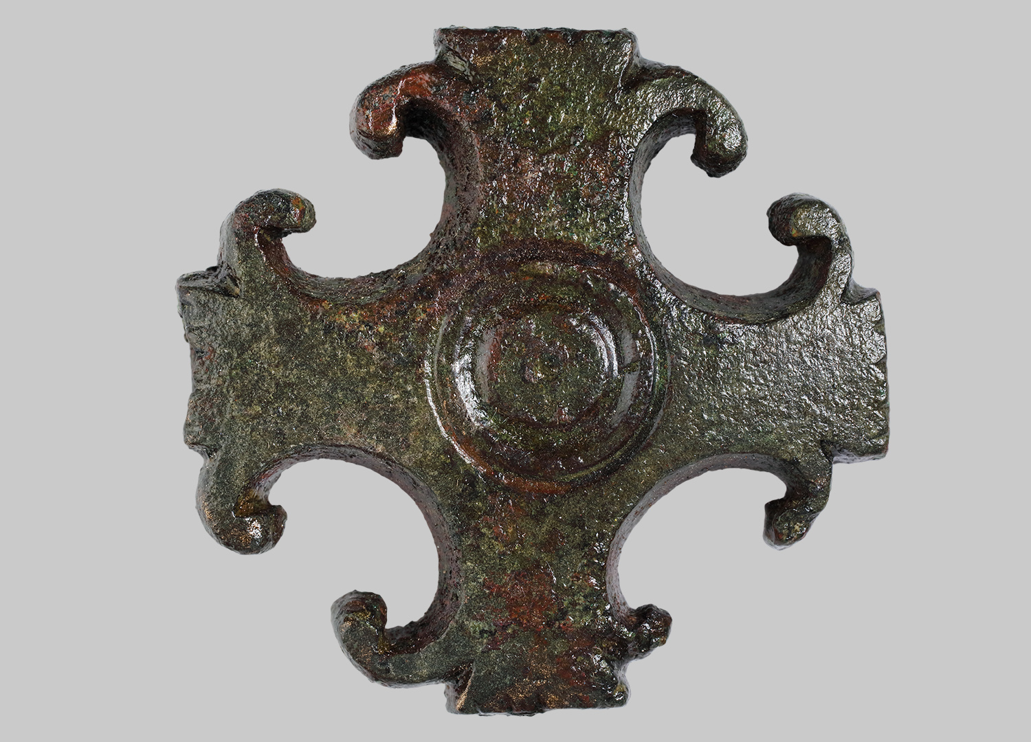 Kreuz- bzw. volutenförmige Enden. Konzentrische Kreisrillen.