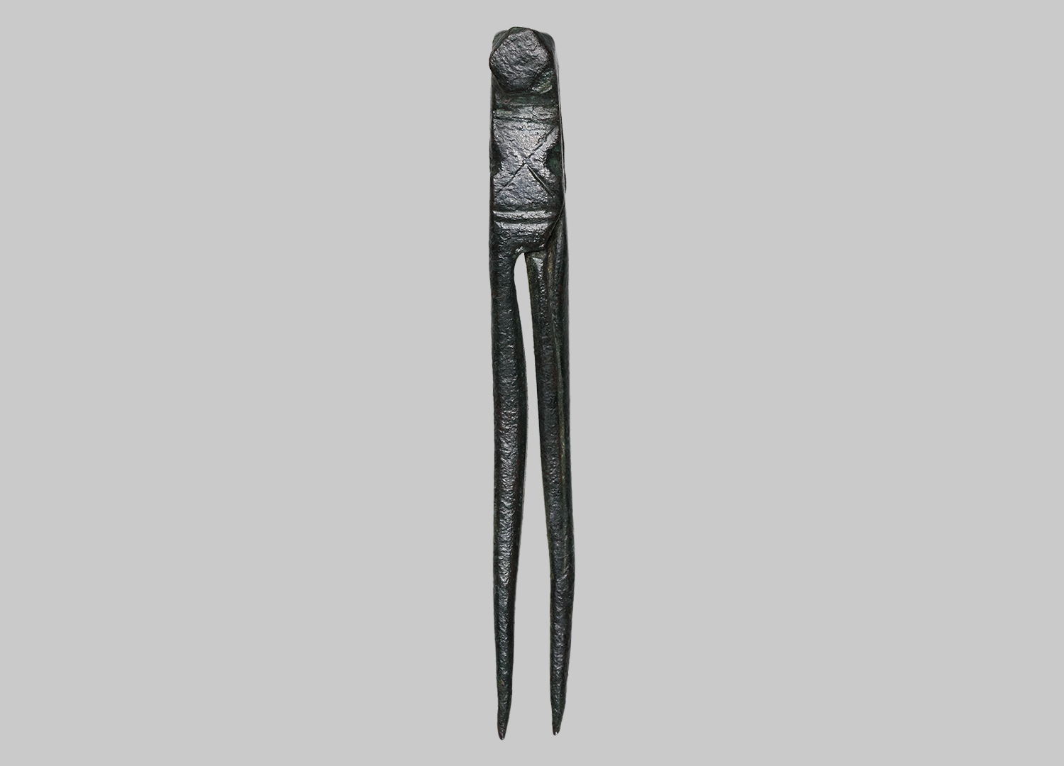 Zwei glatte Schenkel mit verbindendem Nietknopf. Schenkel im oberen Bereich erweitert und verziert: profilierte Leisten, sich überkreuzende Ritzlinien.