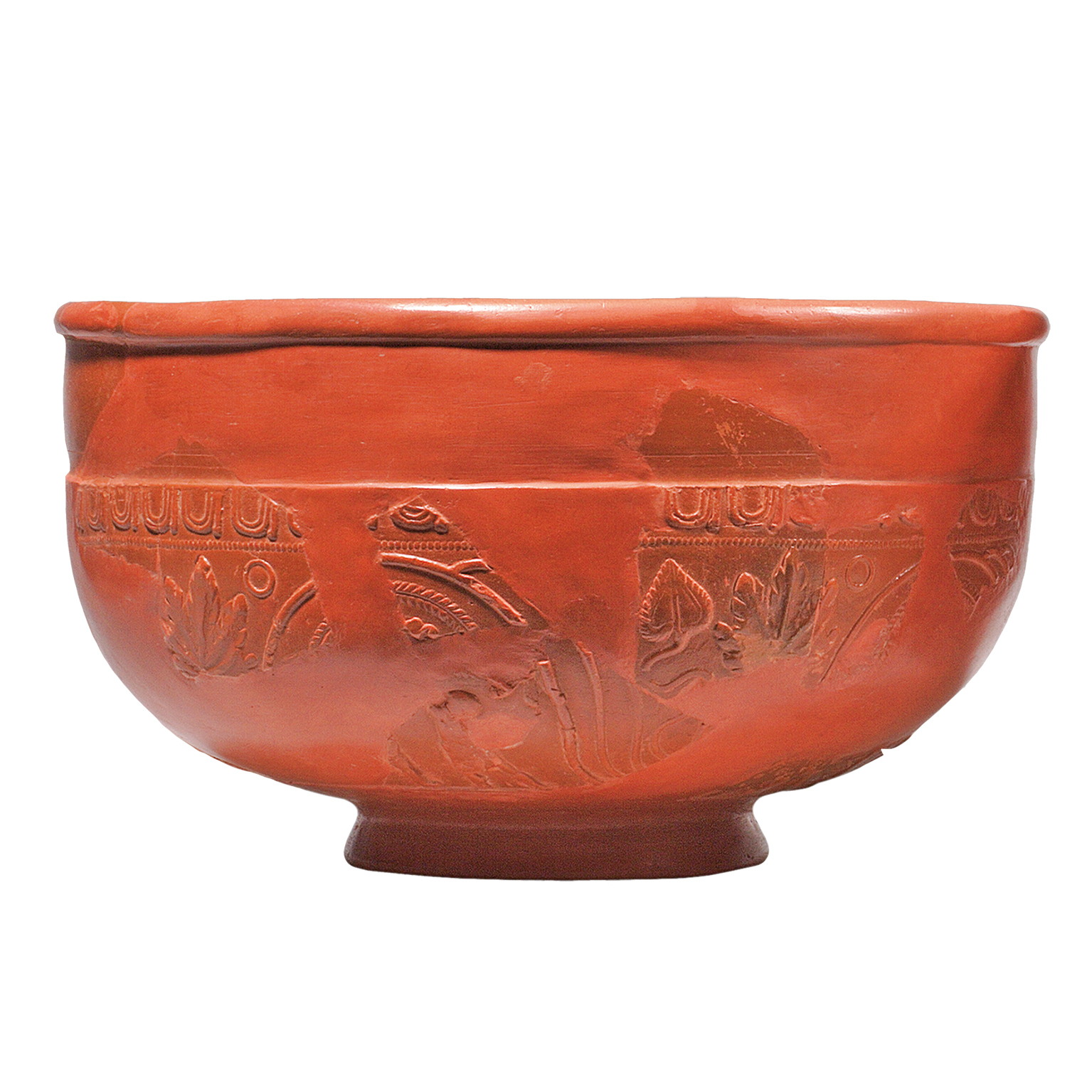 Restaurierte und ergänzte Bilderschüssel. Den oberen Abschluss der Reliefzone bildet ein umlaufender Eierstab. Die Hauptzone ist durch wellenförmig angeordnete Ranken dekoriert. Hier zeigen sich Motive rund um das Thema des Gladiatorenkampfes. Zwischenräume werden durch Blätter und ringförmige Elemente aufgefüllt. Mittelgallisches Erzeugnis aus Lezoux, Töpfer: Cinnamus.