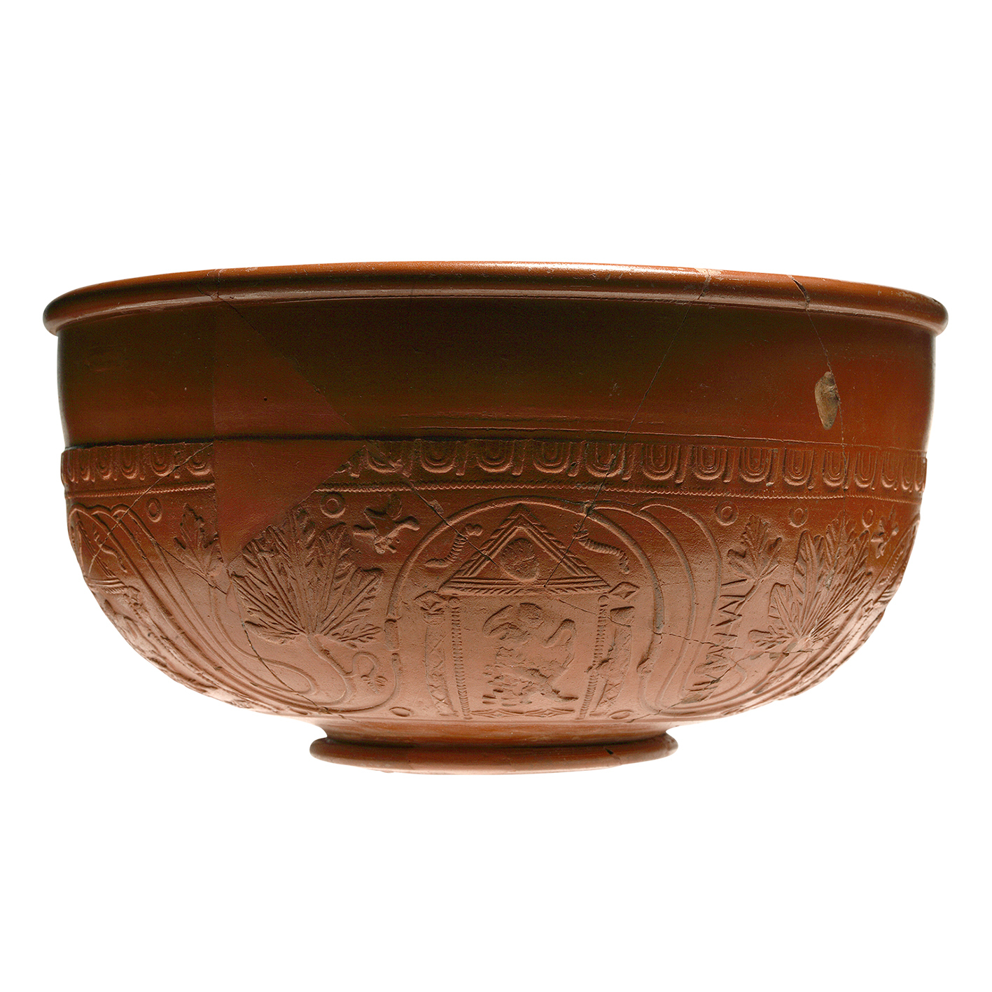 Restaurierte und ergänzte Ganzform. Eier- und Perlstab bildet den oberen Abschluss der Reliefzone. Im Hauptfeld gliedern wellenförmig angeordnete Ranken die Fläche. Innerhalb der Bögen werden abwechselnd große Blätter und aediculae mit darin sitzenden Dianafiguren dargestellt. Als Füllmotive fungieren Kringel und Vögel. Vertikaler Bildstempel des CINNAMI, Erzeugnis aus Lezoux (Mittelgallien).