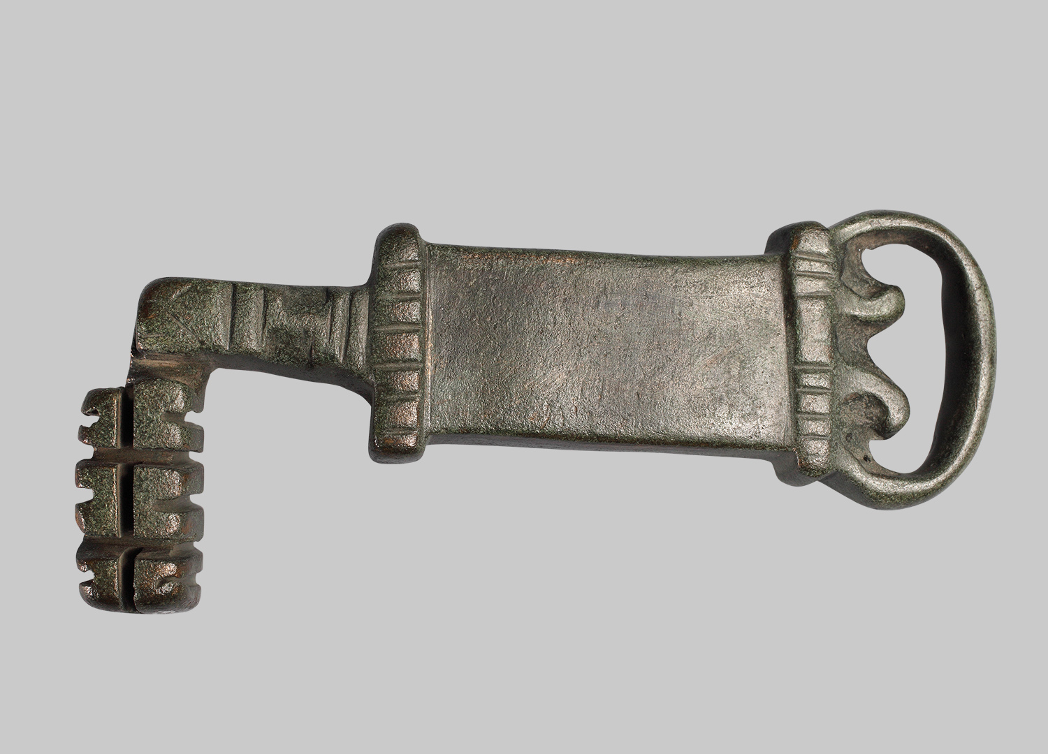 Schiebeschlüssel mit unterständigen Zinken, nierenförmigem Griff und im Querschnitt rechteckigem Schaft. Die Ringöse und der hohle, eingetiefte Schaft sind stark und durch profilierten Stegen mit Kerbenmuster vom Griff abgesetzt. An der Oberseite des unteren Schaftendes befinden sich vertiefte Kerbenmuster mit Profilierung. Der abgewinkelte Bart besteht aus sechs u-förmigen Zinken.