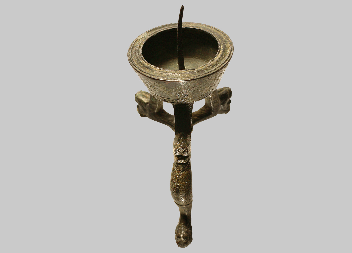 Kleiner Dreifuß, als Kerzenständer/-halter verwendet. Vom inneren Boden der runden Kerzenschale ragt ein Eisenstift senkrecht, über den Schalenrand hinweg, empor. Hier wurde die Kerze aufgesteckt. Die Schale sitzt auf drei kantigen Stützen, die in geschwungene Raubtierbeine übergehen. Die Stützen sind durch Querstreben miteinander verbunden. Im Schnittpunkt der Streben sitzt ein senkrechter Stift. Am Übergang von den Stützen zu den in Pranken auslaufenden Raubtierbeinen befindet sich ein plastisch gestalteter Panther- oder Löwenkopf mit geöffnetem Maul.