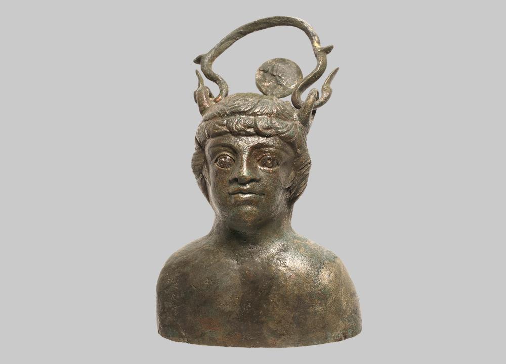 Das vollständig mit Deckel und Henkel erhaltene Büstengefäß stellt einen jungen Schwarzafrikaner dar. Büstengefäße dieser Art dienten als Balsamarien oder als Ölbehälter.