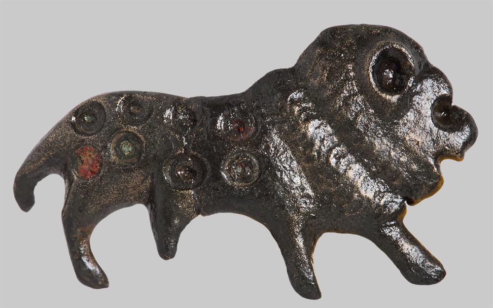 Nach rechts schreitender Löwe. Ein Hinterbein nur im Ansatz erhalten, auch der Schweif erscheint etwas kurz geraten. Mähne in Form zweier gekerbter Bänder ausgebildet. Am Kopf ein markantes Ohr sowie die Andeutung von Maul und Auge. Am Körper acht in Kreisaugentechnik hergestellte und ursprünglich mit Email-Einlagen gefüllte Vertiefungen. Reste davon sind noch erhalten. Flache Rückseite mit Spiral- und Nadelhalter, Nadel und Spirale fehlen. Die Fibel ist leicht nach innen gebogen.