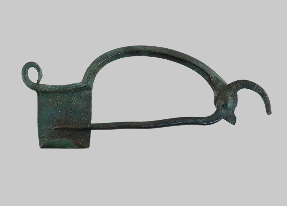 Im Querschnitt rhombischer Bügel, halbkreisförmig gebogen. Schlingenartig zurückgebogener, kurzer Fuß. Wolfszahnverzierung am hohen und breiten Nadelhalter. Nadel und Bügelkopf bilden bei ihrem Zusammentreffen eine Zangenform.