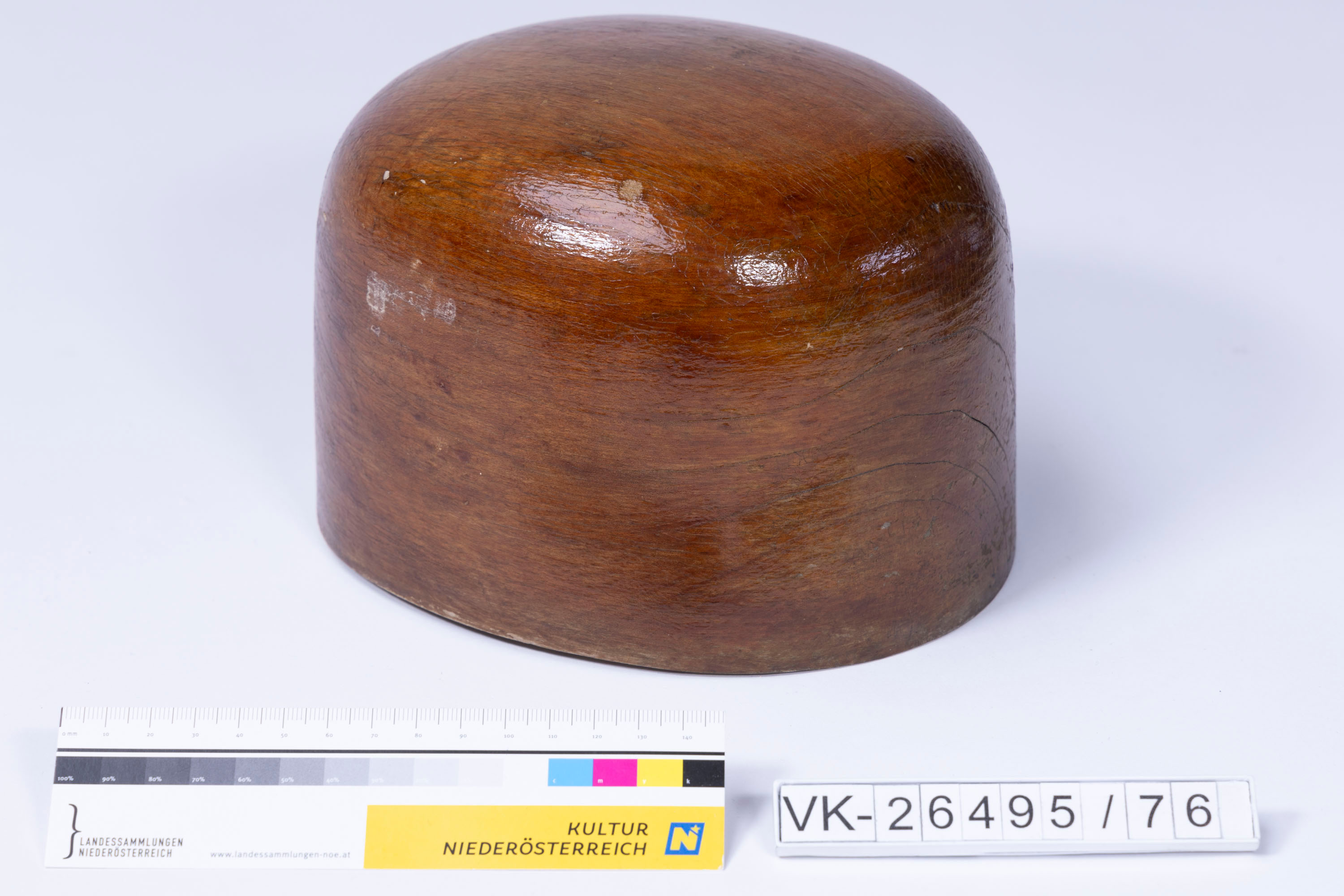 Holzform lackiert, Model (positiv) mit drei großen (2,7 cm) und zwei kleineren (1,9 cm) Löchern an der Unterseite zur Befestigung in einer Drehmaschine. Eingravierte Nummer "53" und Graphitmarkierung (Kreuz) an der Unterseite.