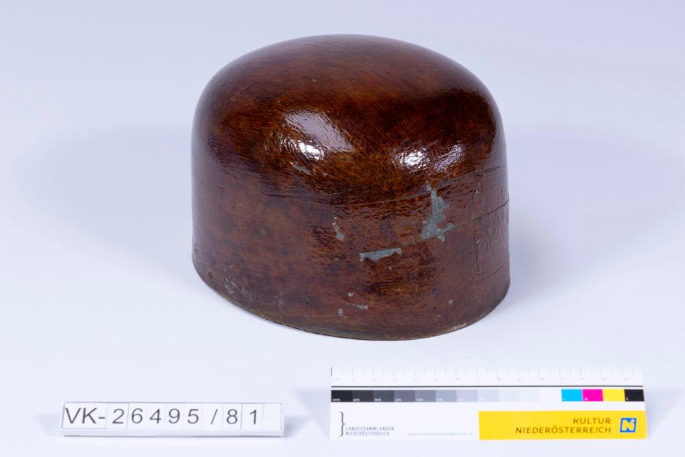 Holzform lackiert, Model (positiv) mit drei großen (2,9 cm) und zwei kleineren (1,6 cm) Löchern an der Unterseite zur Befestigung in einer Drehmaschine. Eingravierte Nummer "55" und Graphitmarkierung (Kreuz) an der Unterseite.