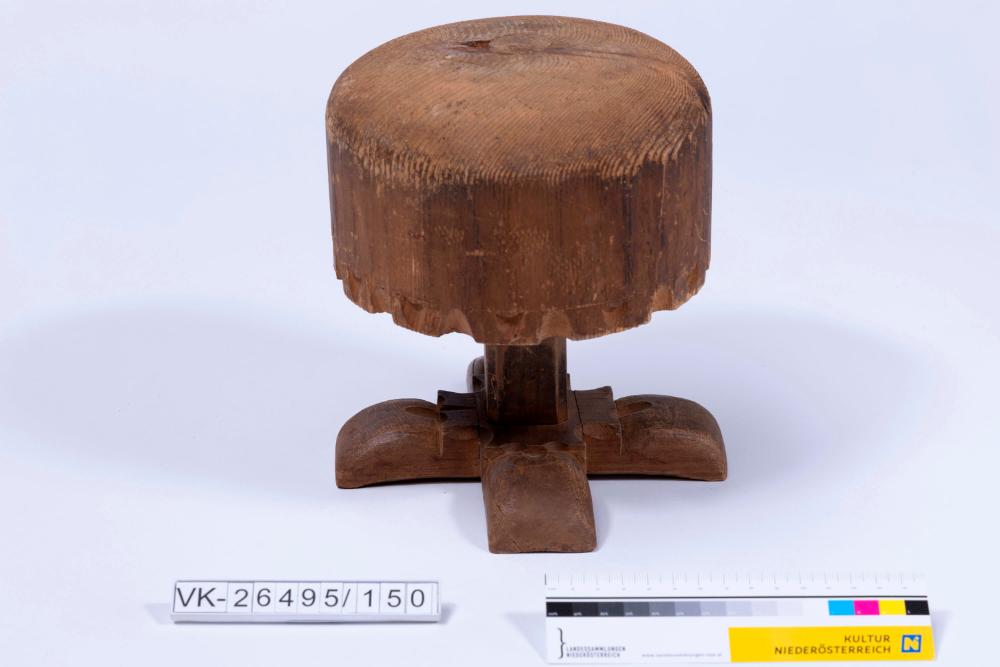 Holzform unlackiert, Model (positiv) auf integriertem kreuzförmigem Ständer mit Zierschnitzerei, an Unterkante der Hutform: gleichmäßige Kerben, An Formunterseite eingravierte konzentrische Kreise