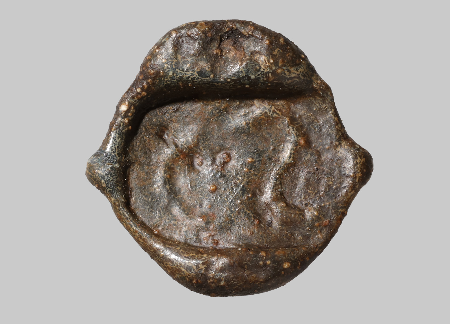 Ovale Plombe mit ovalem Stempel; Buchstaben RD; hinten waagrechte Durchlochung