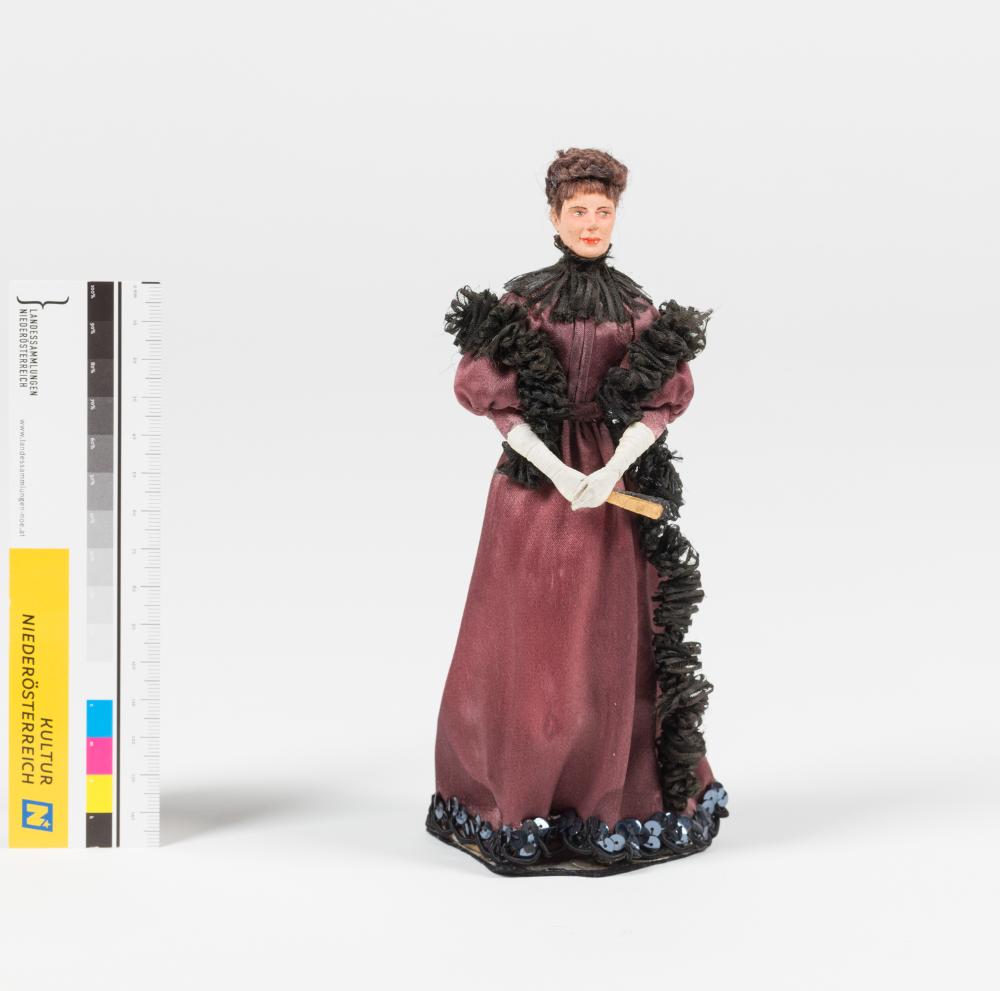 Die Figur zeigt die späte Kaiserin in schlichter, dunkler Robe mit ausladender Textilboa und Fächer in der linken Hand.